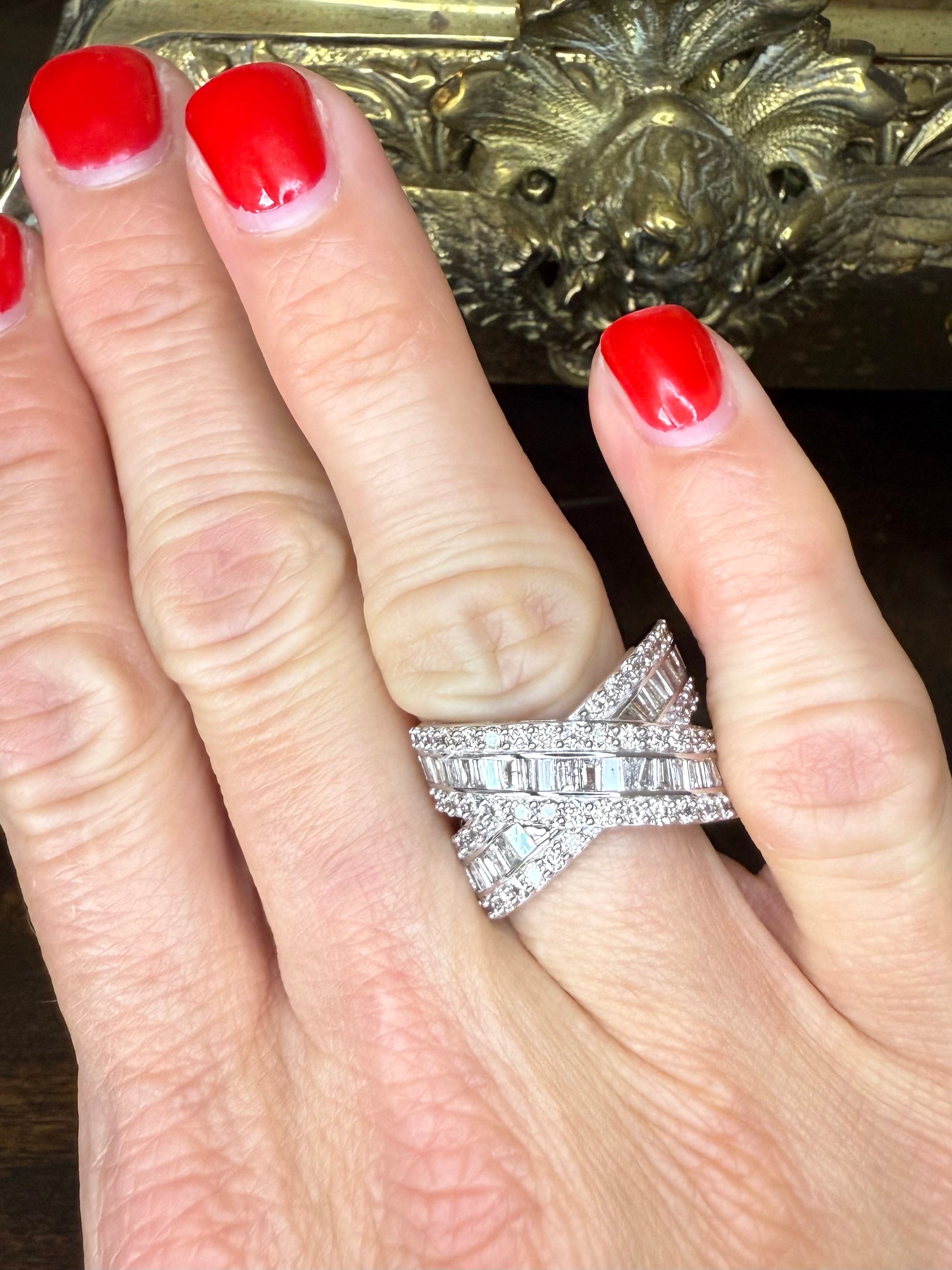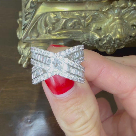 This exquisite 10k gold crossover band features 2.00 carats total weight of carefully selected diamonds, expertly set to create a stunning, intertwined design that symbolizes elegance and timeless style. Sized at 7, this ring has been evaluated by a GIA graduate gemologist to ensure authenticity and quality. As a preowned estate piece, minor markings or imperfections may be present, adding character and unique history to the jewelry without compromising its beauty or craftsmanship. This crossover band is a sophisticated choice for those seeking refined luxury with a story to tell.