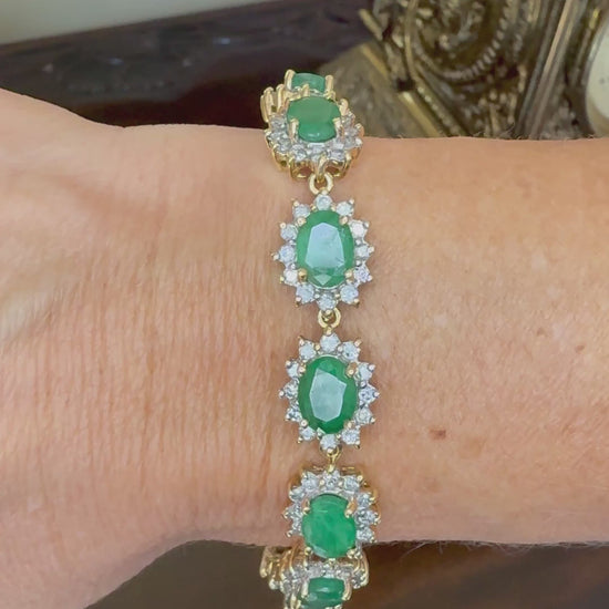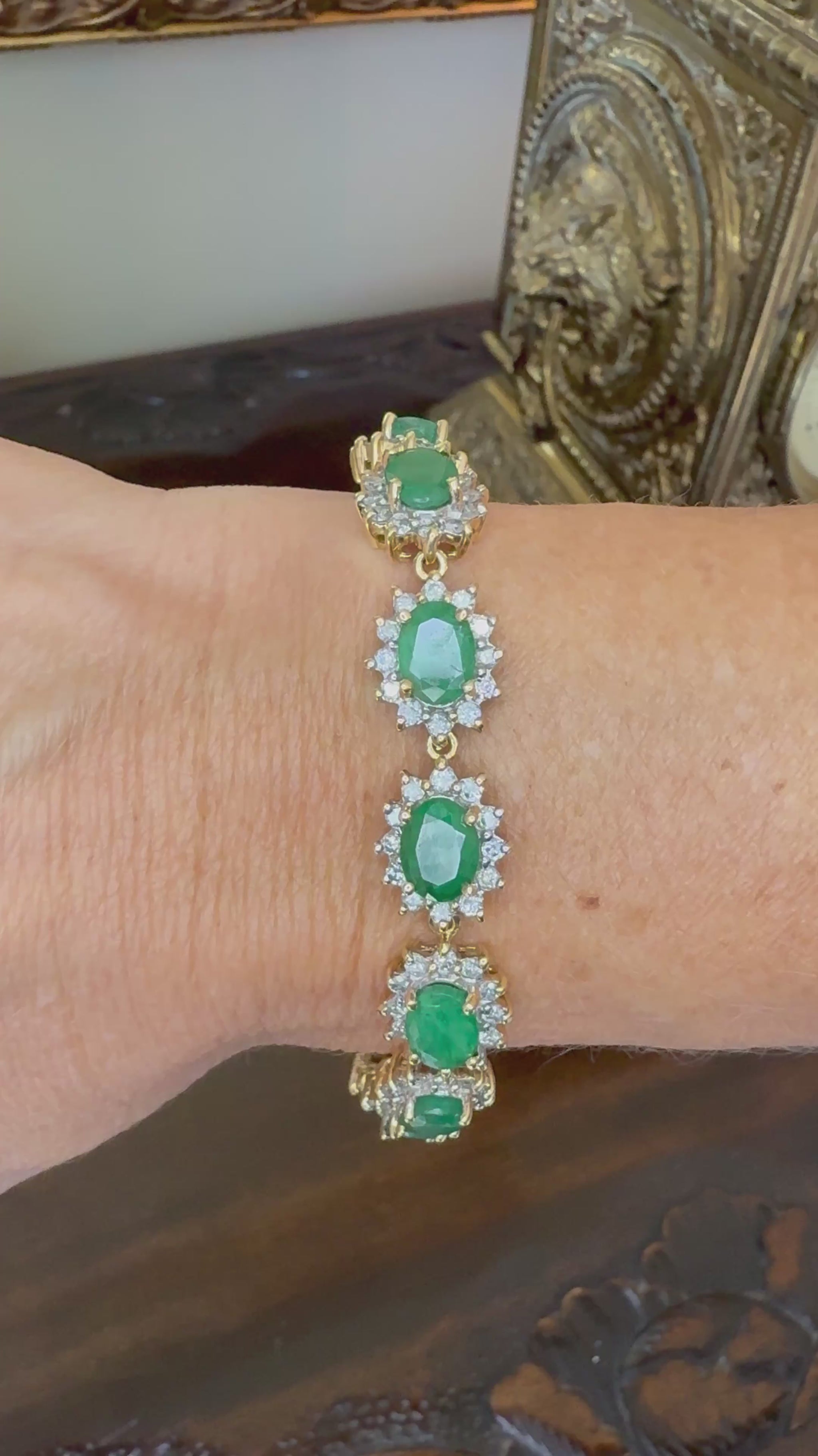One (1) 14k yellow gold Emerald and diamond straight line bracelet, eleven (11) oval shaped basket type links each center set with a 8.0 X 6.0mm oval shaped Emerald, approximate total weight 13.25 carats. The Emeralds have a grayish green color, moderately included, semi-cloudy, medium to low saturation. The Emeralds are each surrounded with 12 0.025 carat round diamonds, approximate total diamond weight 4.00 carats, graded I2 and K/L in color. The bracelet weighs 21.0 grams. Estimate replacement cost=$9,400.