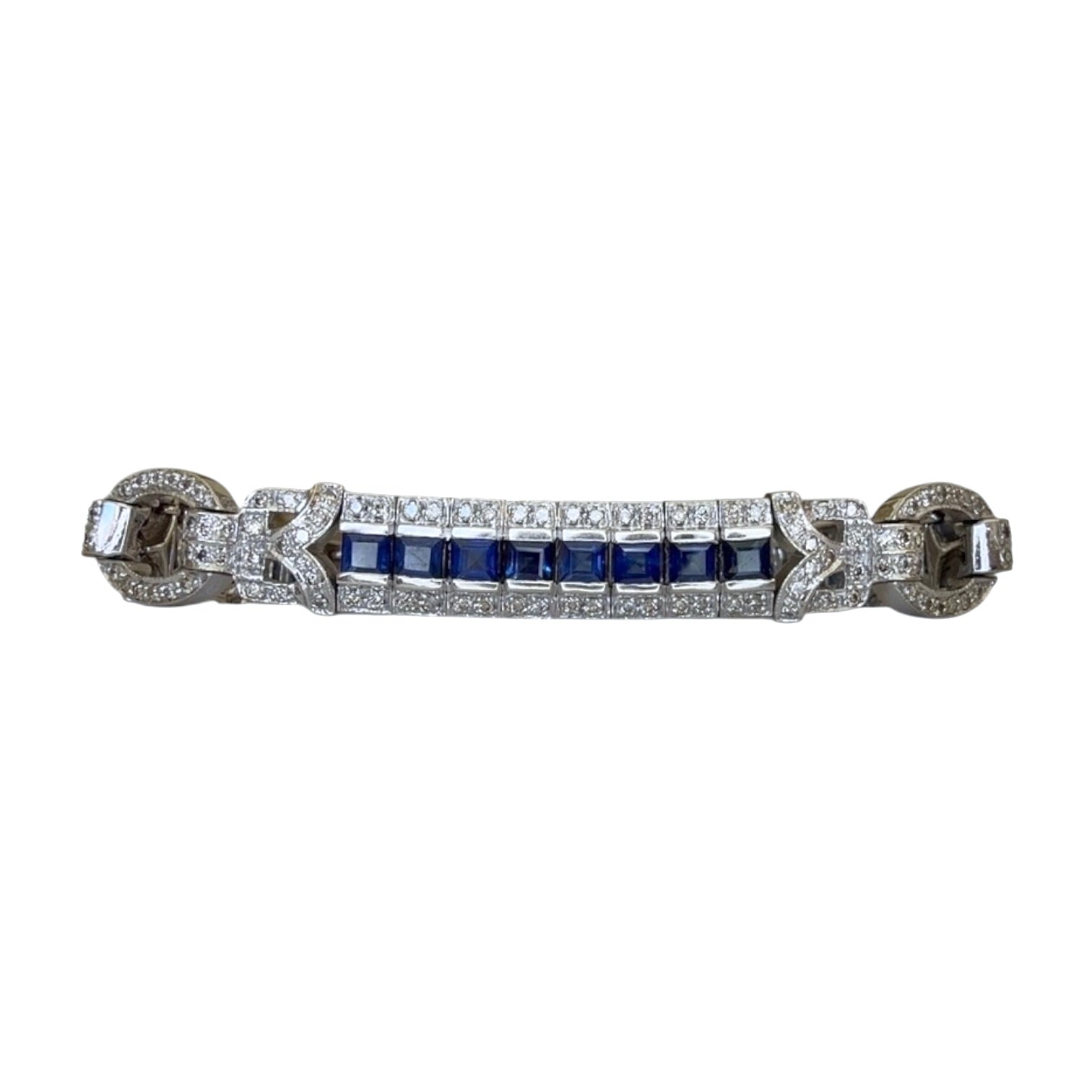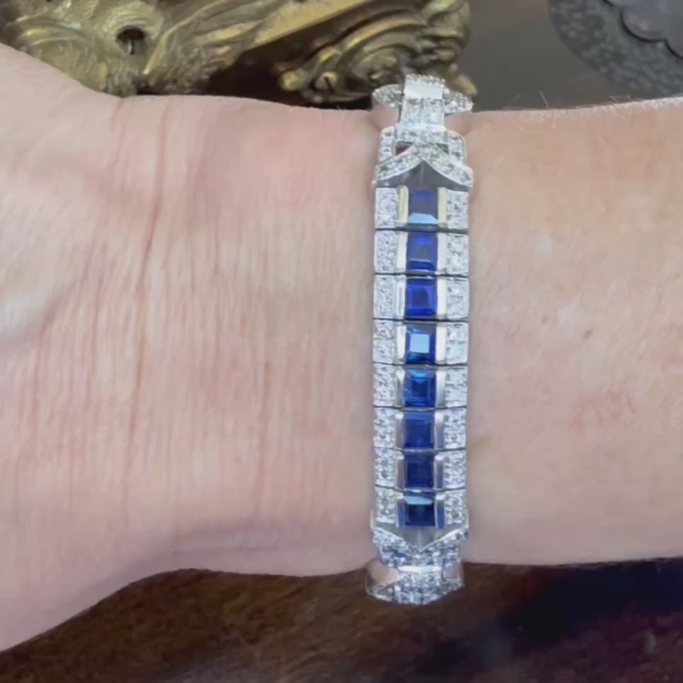 One (1) 14K white gold Vintage style Blue Sapphire and diamond Bracelet. The bracelet consist of three flexible rectangular shaped sections connected by a diamond accented trim.The three flexible sections are each bar set with eight (8) 3.25 x 3.25 mm square-shaped Blue Sapphires. The approximate total weight of the twenty-four (24) Sapphires is 8.00 carats, violet blue color, dark in tone. On each side of the Sapphires is a bead set round brilliant cut diamond. The connected trim each set with forty - eight round diamonds. The approximate total weight of the two- hundred forty (2 40) diamonds is 2.00 carats, graded S12 clarity and H/l in color. The bracelet weighs 30.80 grams.