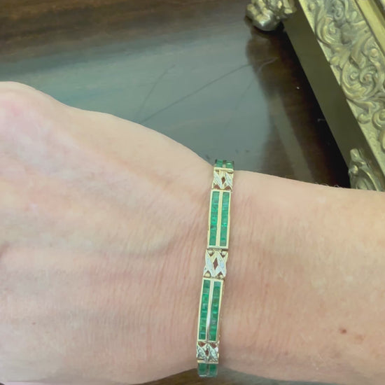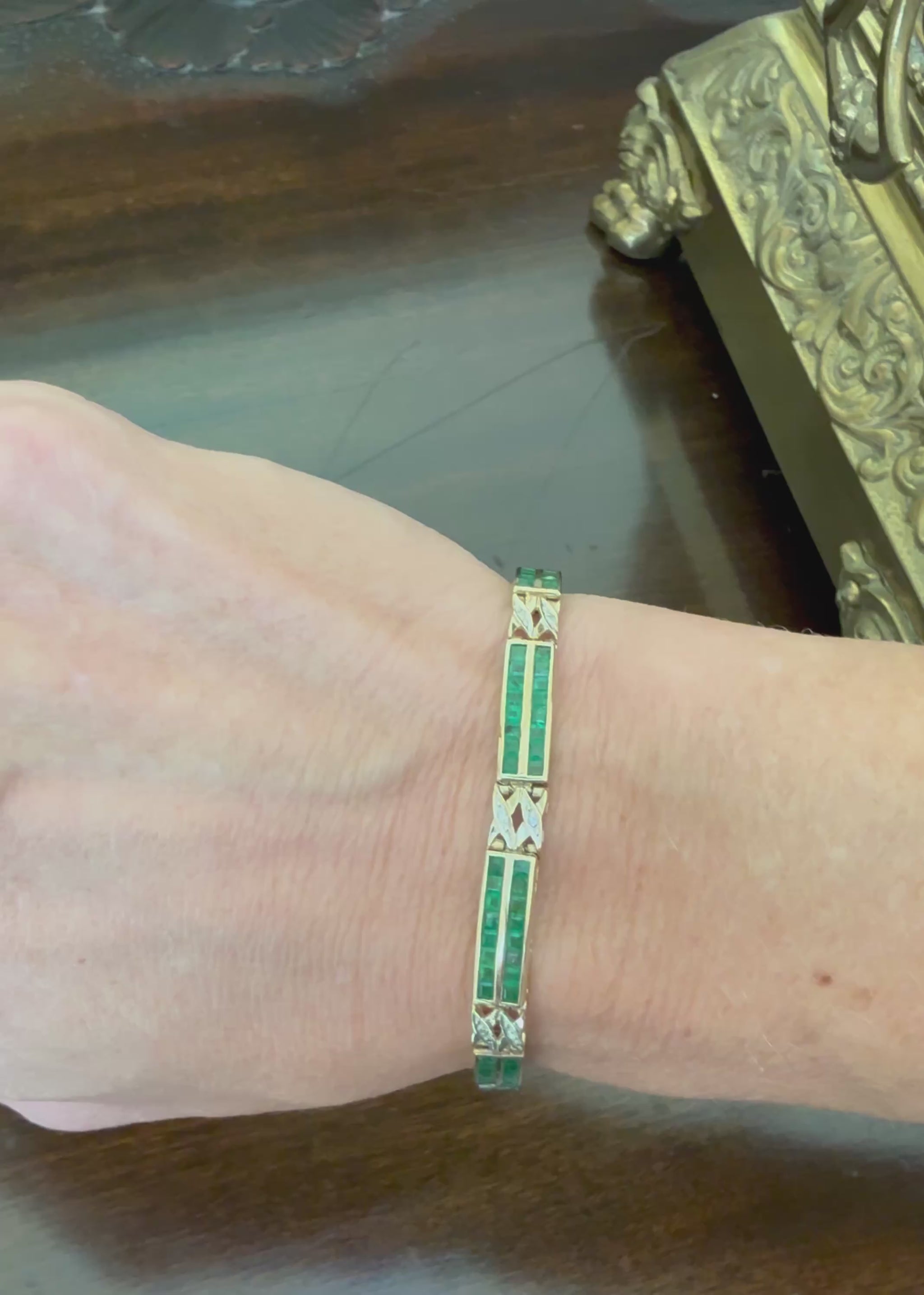 One 14k yellow gold Emerald and diamond bracelet, 7 inches long, with nine (9) rectangular shaped links each link set with two rows of square Emeralds eight in each row. The Emeralds measure approximately 1.50 x 1.50mm, approximate total weight 3.00 carats. The Emeralds have a slightly bluish green color, medium saturation and well matched. The Emerald links are each connected with a pierced link with two "X" shaped setting each set with a 0.005 carat round diamond, approximate total diamond weight 0.10 carats, I1 clarity and I/J in color. The bracelet weighs 14.20 grams. Estimate Replacement Cost=$8,200
