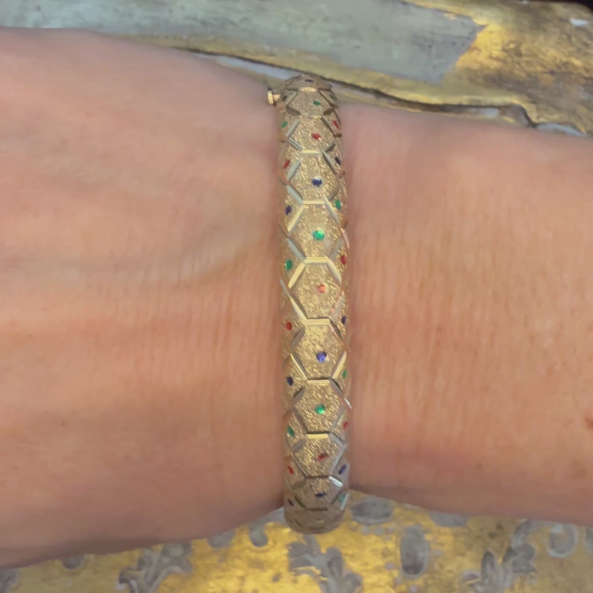 This exquisite 14K multicolored enamel bangle represents a distinguished piece of estate jewelry, meticulously authenticated by a GIA graduate gemologist. The vibrant enamel work showcases masterful craftsmanship across multiple hues, creating a striking visual composition that complements both classic and contemporary styles. Crafted in 14K gold, this bangle offers enduring quality and wearability for everyday elegance or special occasions. As a preowned estate piece, the bracelet may display minor surface markings or patina consistent with its history—characteristics that enhance its authenticity and charm. Each imperfection tells a story of timeless design and careful preservation. An ideal addition to curated jewelry collections, this bangle bridges vintage aesthetics with lasting investment value.
