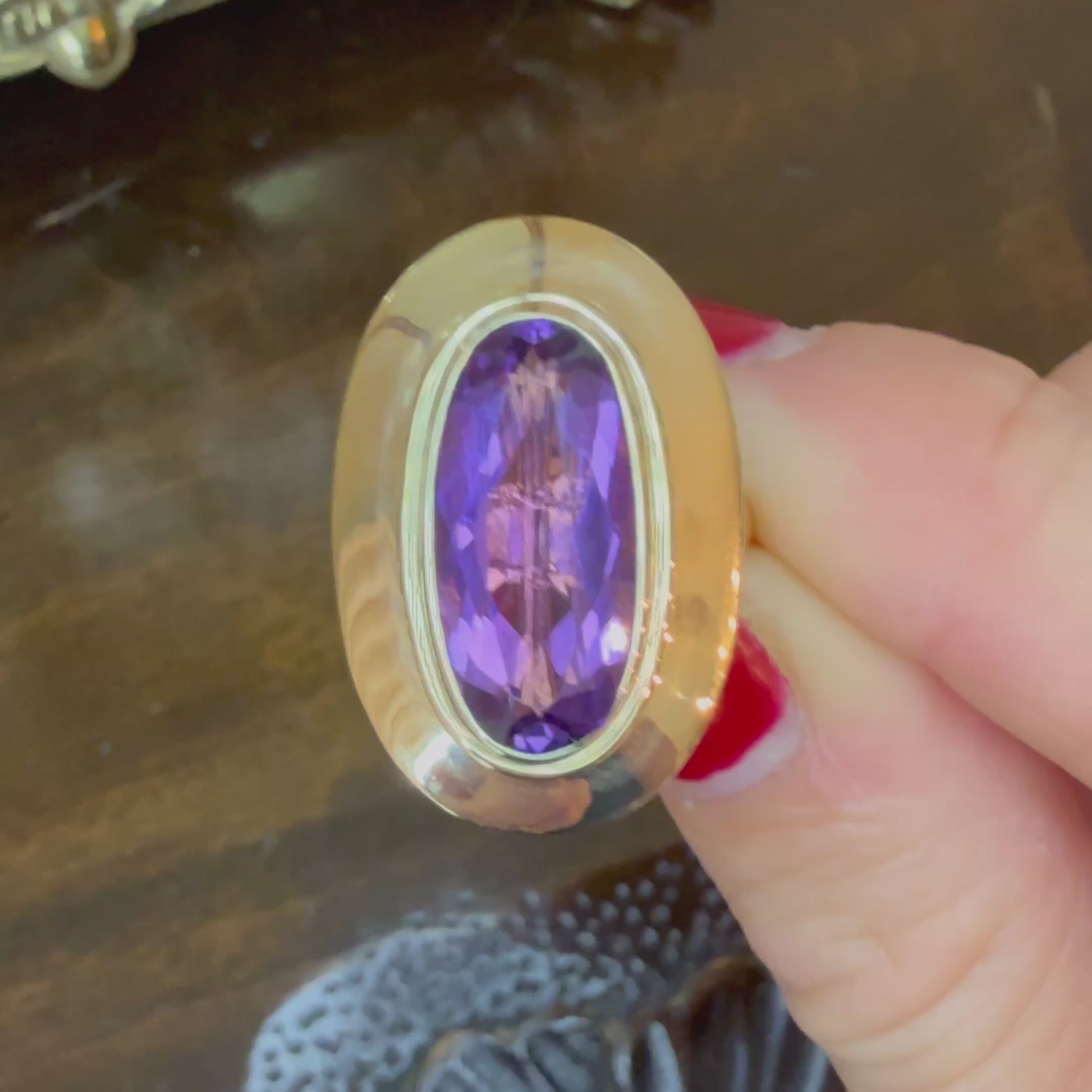 14k Oval Amethyst Ring with Wide Polished Bezel. Size 6.5. This exquisite estate ring showcases a stunning oval-cut amethyst set within a substantial 14k gold bezel, meticulously polished to enhance the stone's natural violet hues. The wide bezel design provides both security and visual impact, creating a sophisticated silhouette that complements various styles. Verified by a GIA graduate gemologist, this piece represents authentic vintage craftsmanship and quality. As with all preowned estate and antique jewelry, minor surface markings and patina are present, adding to its character and provenance. An investment-worthy addition to any fine jewelry collection.