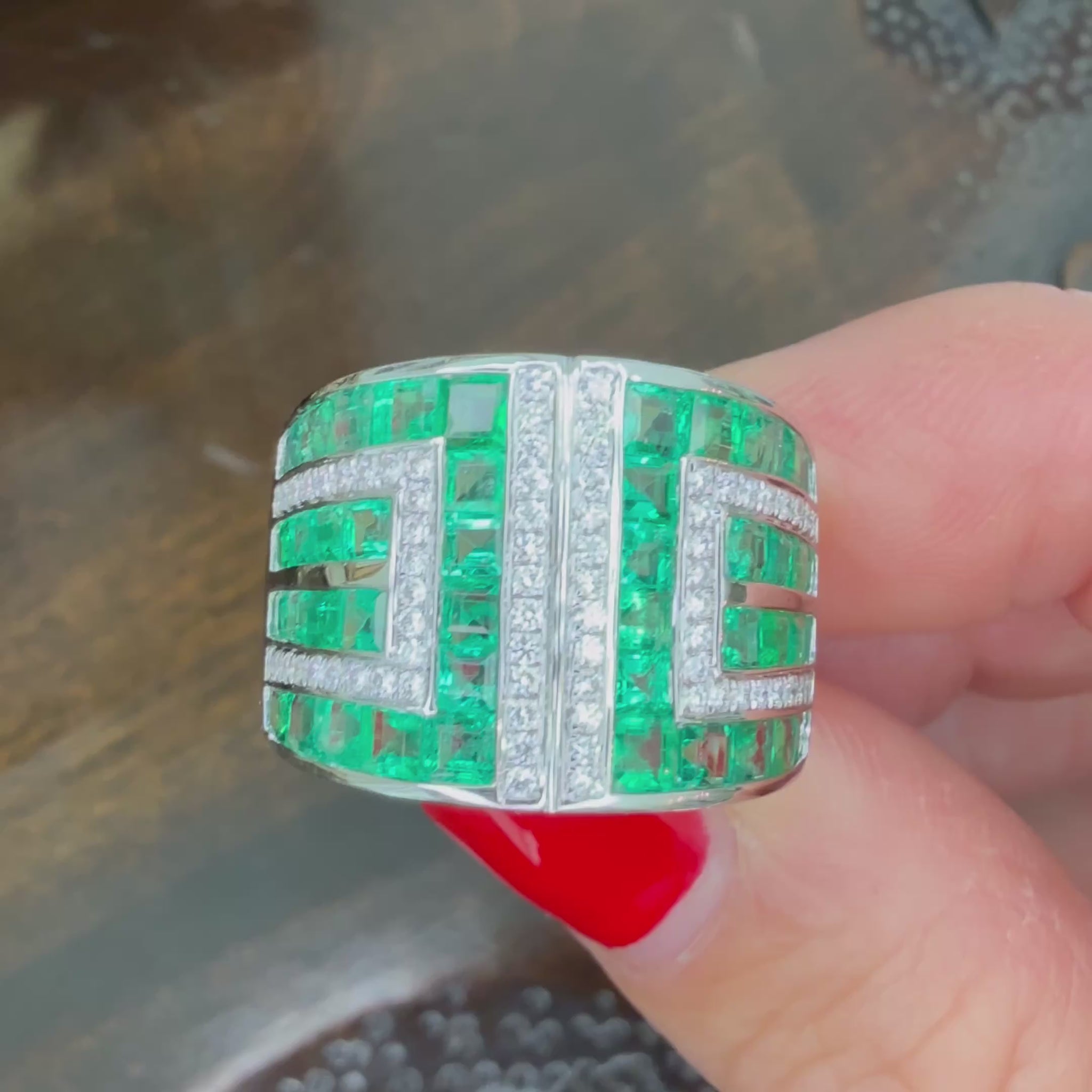 This exquisite 18K gold band features a total of 3.35 carats of vibrant emeralds paired with 0.36 carats of sparkling diamonds, weighing a substantial 7.81 grams. Expertly crafted, the ring combines the rich green hues of high-quality emeralds with the brilliance of carefully selected diamonds, creating a balanced and sophisticated design. Each gemstone has been thoroughly evaluated by a graduate gemologist, ensuring authenticity and superior quality. This brand-new band is an elegant choice for collectors and connoisseurs seeking a timeless piece that offers both luxury and lasting value.