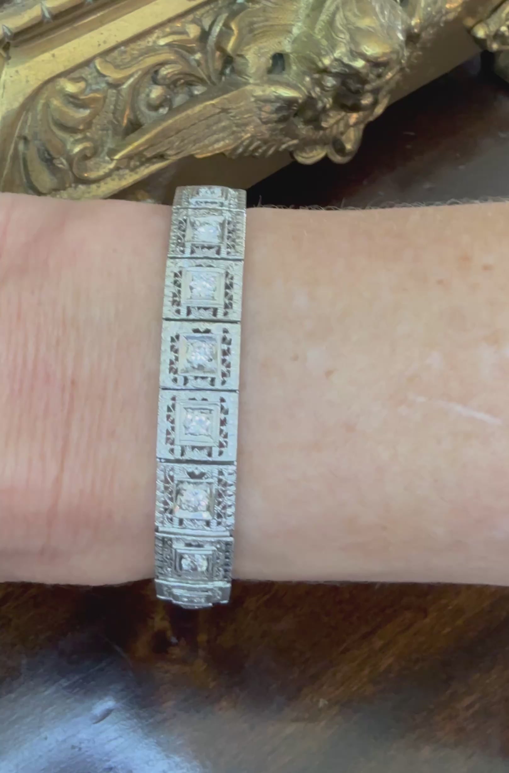 One ladies hand assembled filigree-style rhodium plated 14K white gold, diamond art deco (1920-1930) hinged bracelet. The bracelet measures approximately 7.00 inches in length by 9.27 mm tapering to 9.25 mm in width and weighs a total of 11.65 pennyweights. Stamped "14K". In excellent condition. Includes a GIA Appraisal. See details of the appraisal below. Appraises at $8,500.