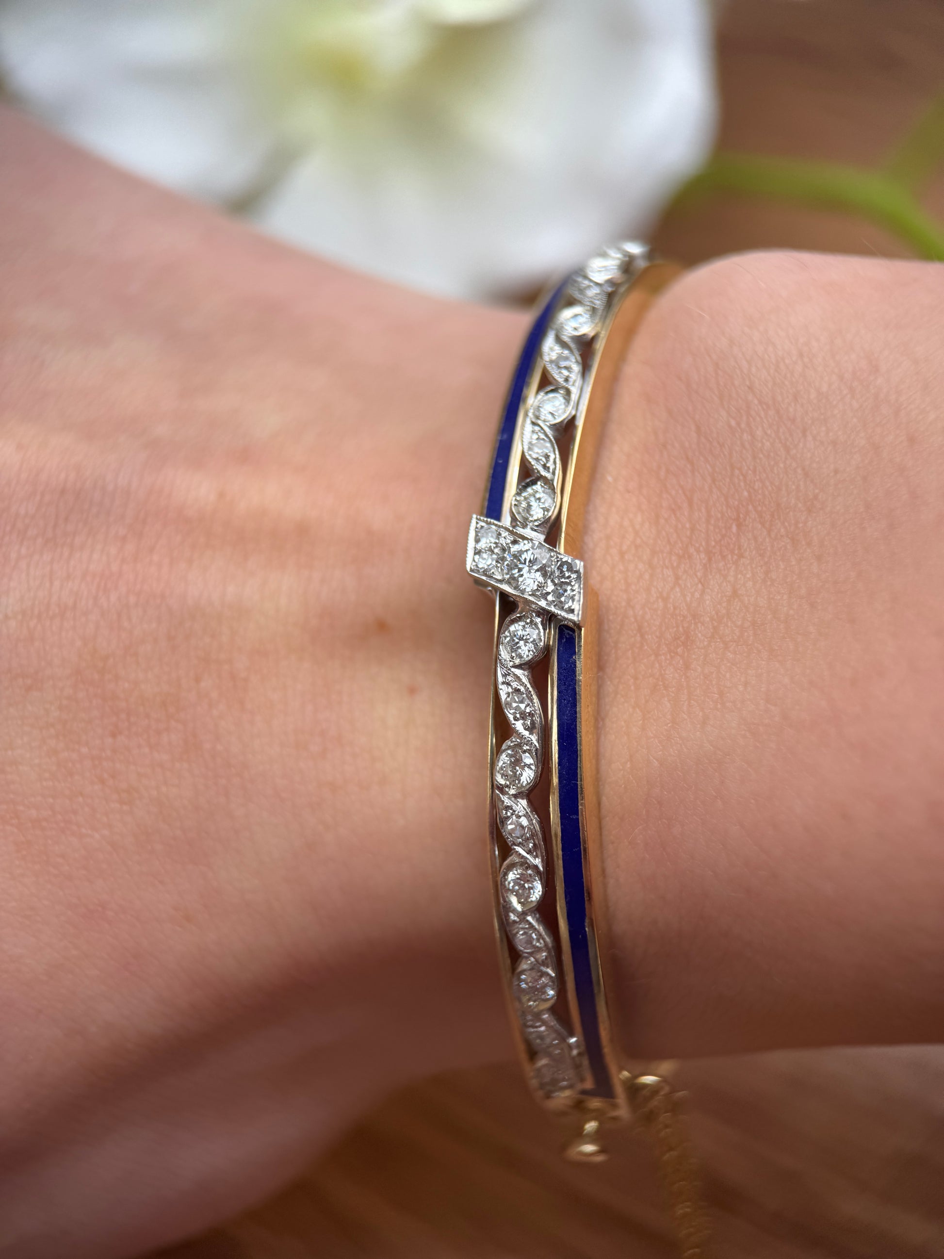 This exquisite Antique Diamond & Blue Enamel Bracelet showcases timeless elegance with its 14 karat yellow gold setting and approximately 0.91 carats total weight of carefully selected diamonds. Measuring 6.5 inches in length, this piece is expertly crafted and verified by a GIA graduate gemologist to ensure authenticity and quality. The rich blue enamel complements the brilliance of the diamonds, creating a sophisticated accessory that enhances any ensemble. As a genuine estate piece, it bears minor markings characteristic of its vintage history, adding to its unique charm and character. Perfect for collectors or those appreciating classic fine jewelry.