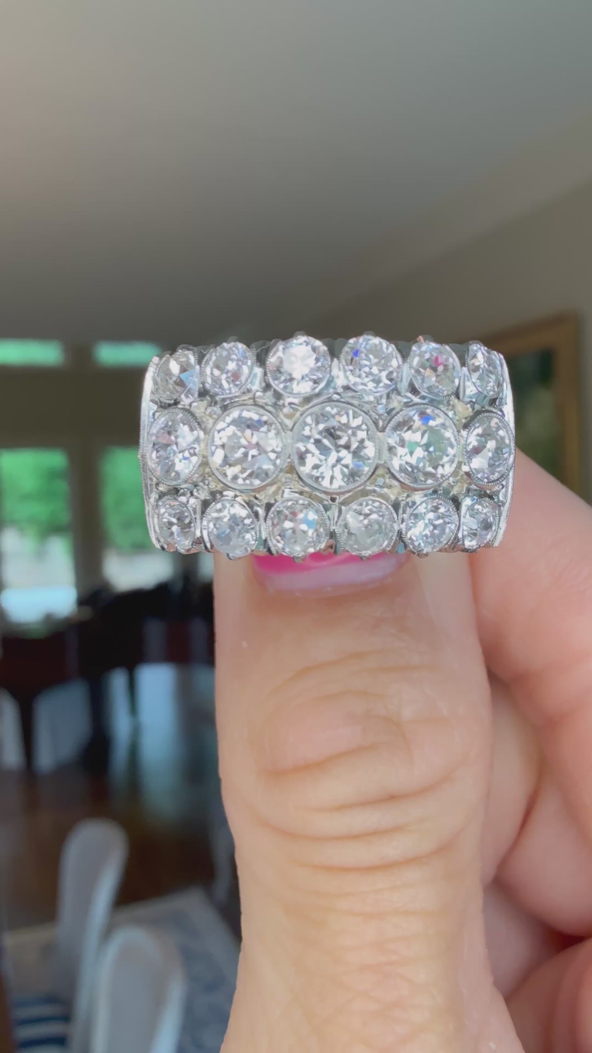 One (1) lady's, Vintage Platinum diamond ring, (Circa 1910) rectangular shaped top measuring 22.0 x 12.0 mm on a 1.50 mm half round shank. The top center is set with one (1) 4.80mm, two (2) 4.60 mm, and two (2) 4.0 mm Mine cut diamonds each bezel set in a millgrain finish.