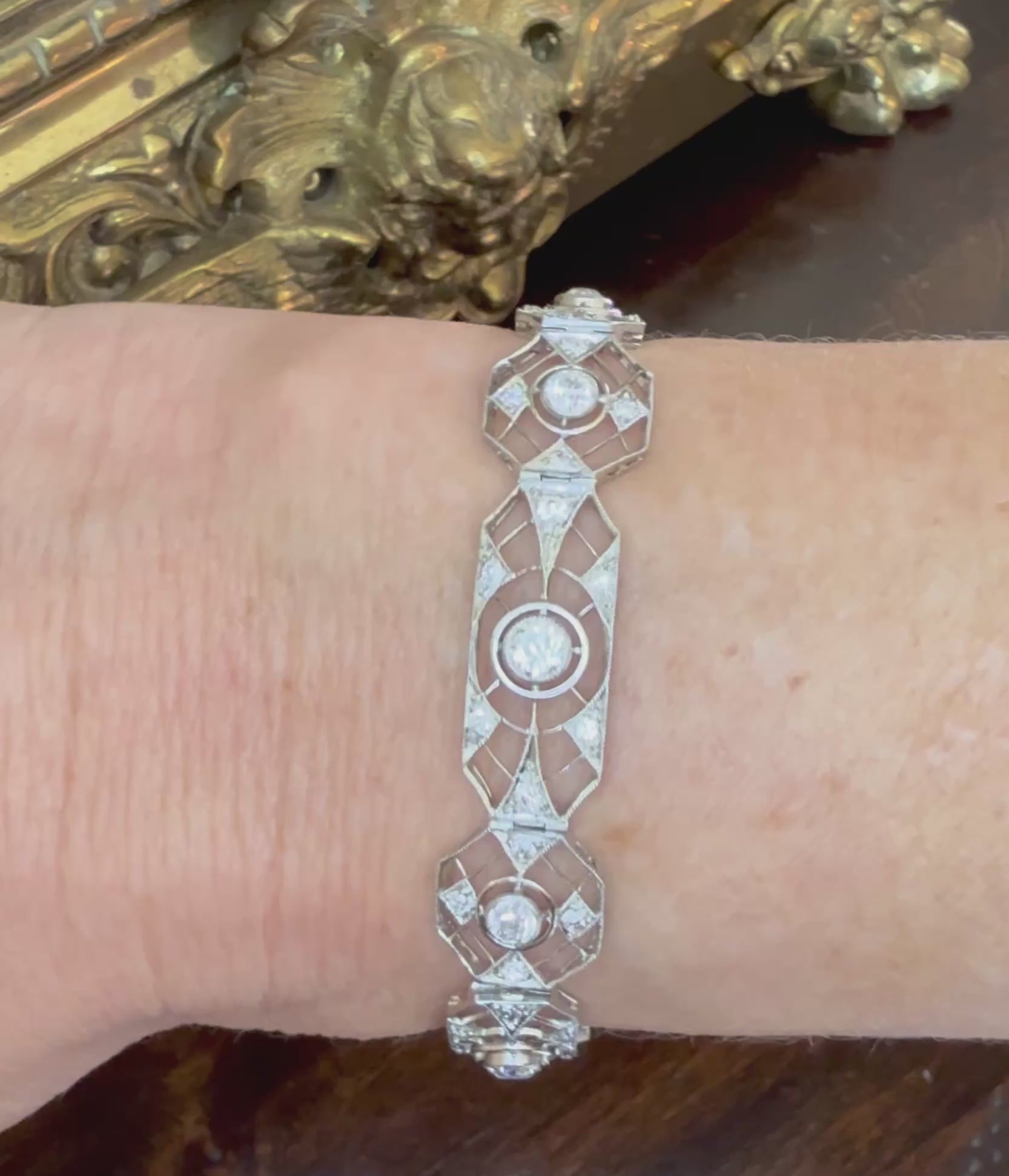 One ladies handmade filigree-style 950 platinum, diamond edwardian (1901-1920) hinged bracelet. The bracelet is 3.60 mm thick and measures approximately 7.75 mm in length by 10.68 mm in width and weighs a total of 10.01 pennyweights. In excellent condition. Purchase includes GIA appraisal. Appraises at $10,500.