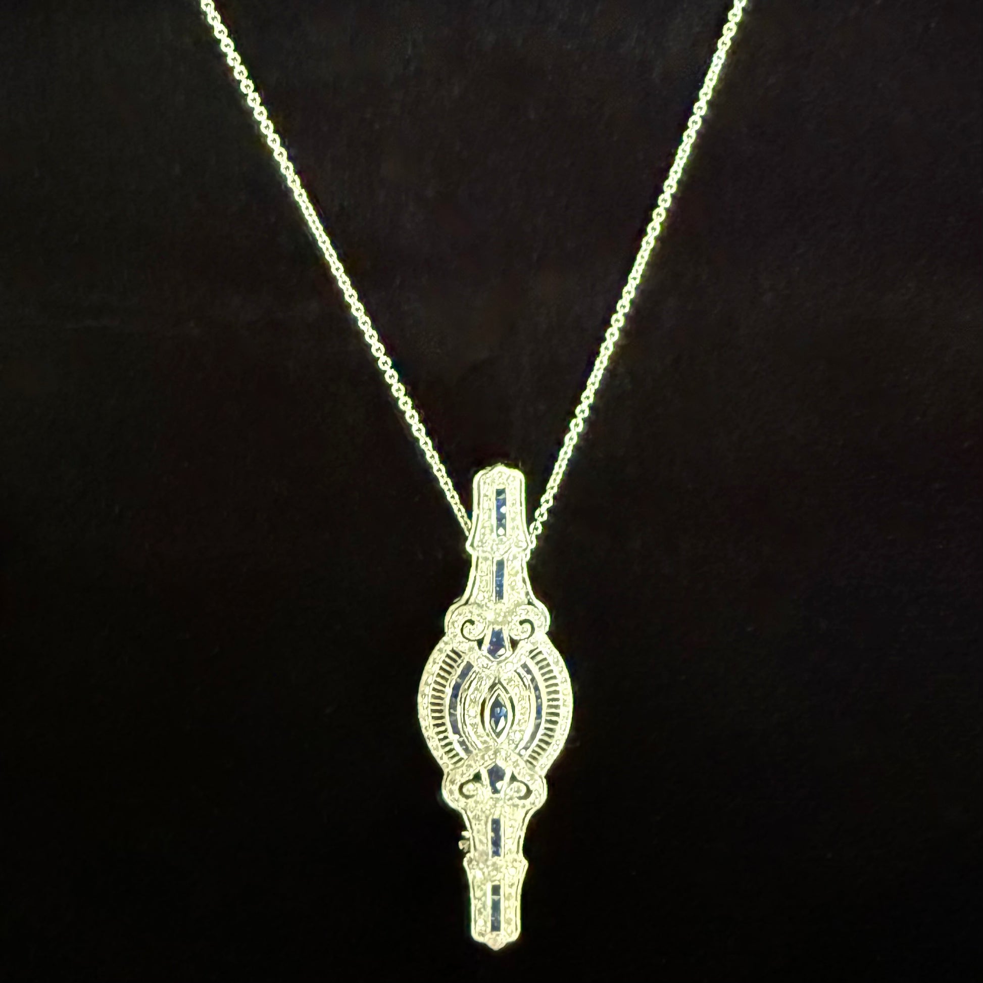 Art Deco 14k Sapphire and Diamond Pin/Necklace. Includes 16inch 14k white gold chain. It is still a pin, but the chain is just loop through the enclosure.