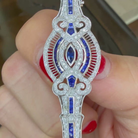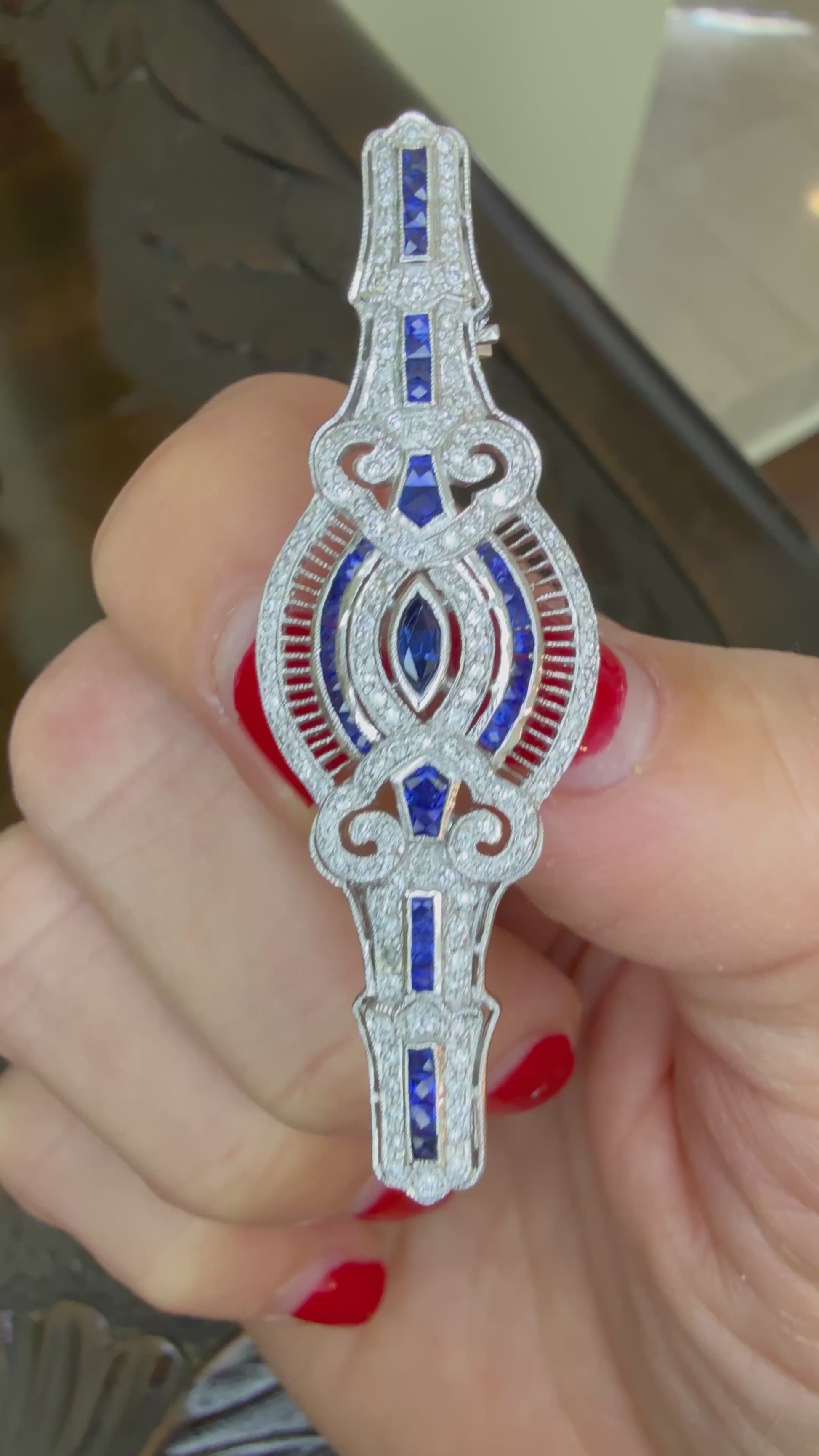 One (1) 14k Rhodium Plated vintage style pin/brooch, 2 inches X 1/2 inch with a pierced motif. The brooch is bed set with one hundred fourteen (114) round diamonds, approximate total weight 0.60 carats, VS2 to SI1 clarity and G/H in color. The brooch is also set with a bezel set 4.0 X 2.0 mm marquis Blue Sapphire two bullet shape and trapezoid shape, and twenty-five 1.0 X 1.0 mm French cut Blue Sapphires. The approximate total weight of the blue sapphires is 0.55 carats. The brooch weighs 7.60 grams. Appraisal value-$3,500