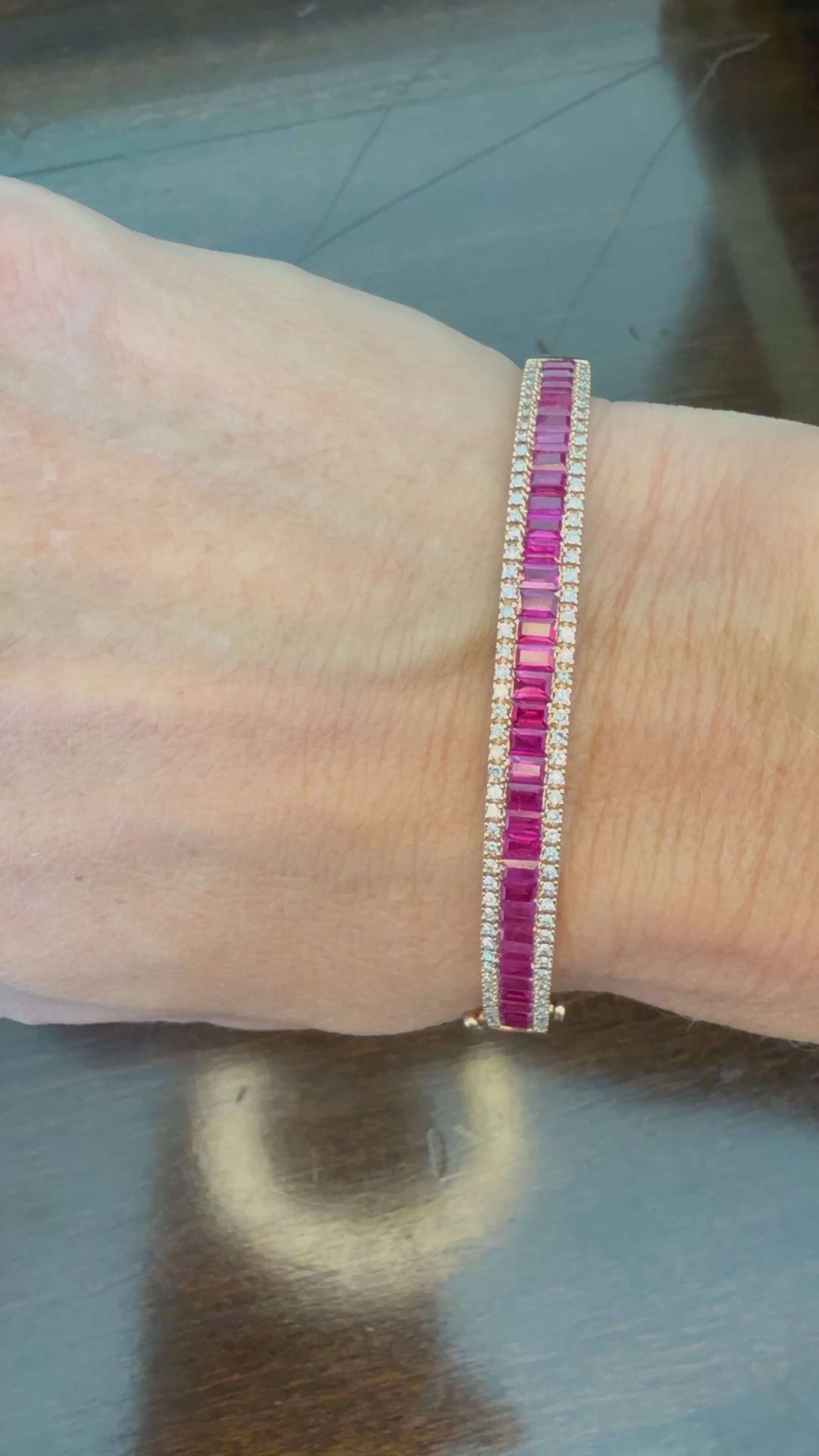This exquisite Effy bracelet is crafted in 14k rose gold, featuring a stunning 3.47 carat total weight of vibrant rubies complemented by .46 carats of brilliant diamonds. Measuring 7.25 inches, it offers a balanced and elegant fit on the wrist. Each gemstone has been meticulously verified by a GIA graduate gemologist to ensure authenticity and quality. As a preowned estate piece, it carries a unique character with minor markings or imperfections that reflect its history. This bracelet is a refined choice for collectors and connoisseurs seeking distinguished, timeless artistry in fine jewelry. Retails New for $16,074.
