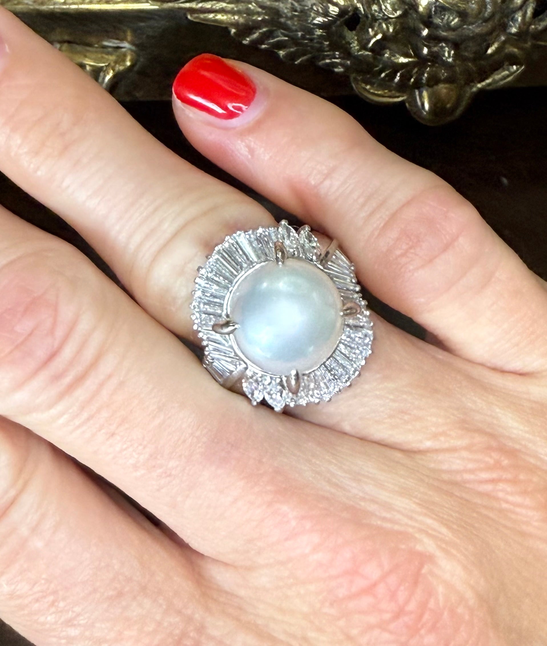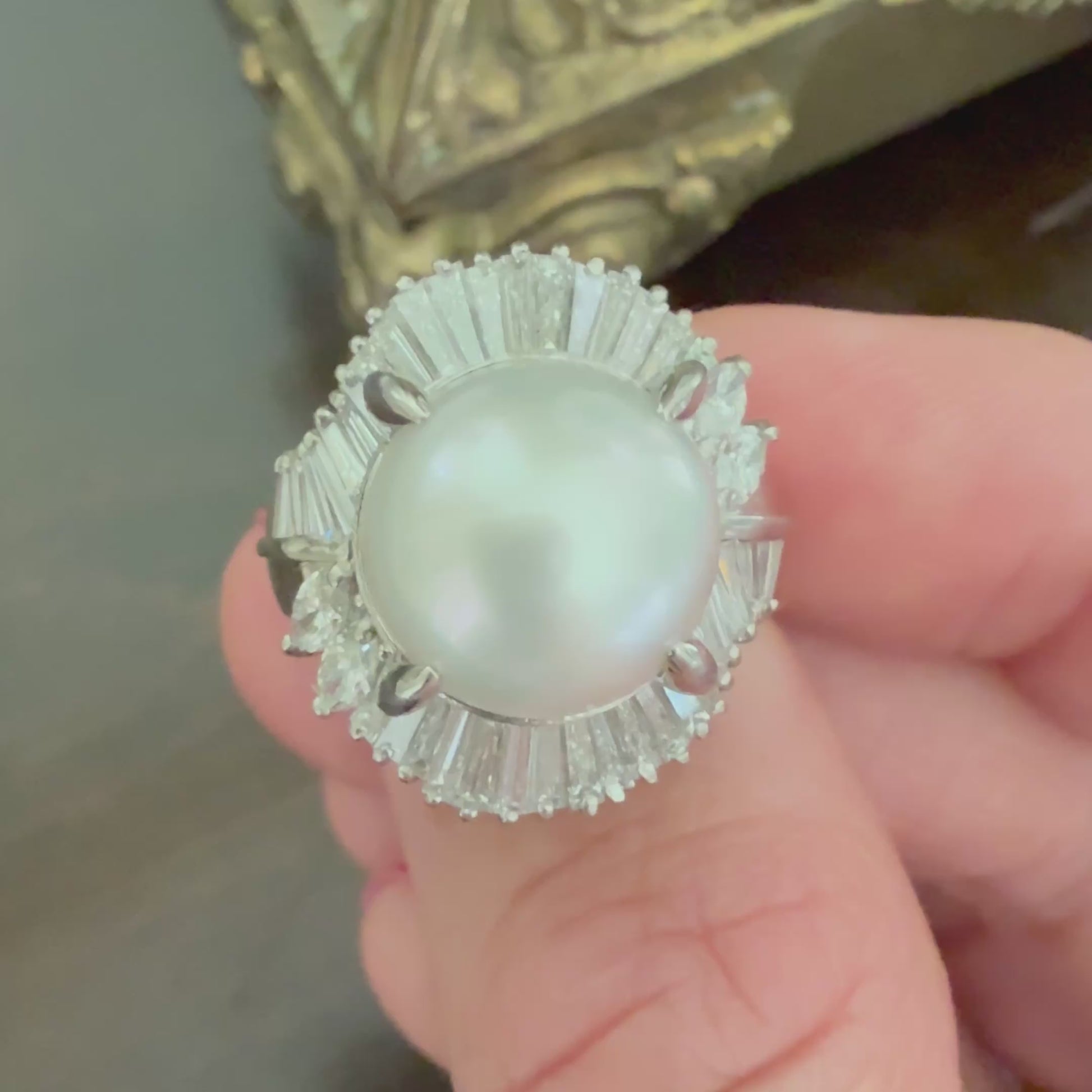 This exquisite Platinum 2.04 CTW Diamond and 12.00 MM Pearl Ballerina Ring, available in size 6.75, showcases a harmonious blend of timeless elegance and expert craftsmanship. Centered by a lustrous 12.00 mm pearl, it is accented by brilliant diamonds totaling 2.04 carats, carefully set to enhance brilliance and depth. This ring has been meticulously authenticated by a GIA graduate gemologist, ensuring quality and authenticity. Please be aware that, as a preowned estate piece, it may display subtle markings or imperfections consistent with its vintage origin, adding to its unique character and distinguished charm. This ring is a refined choice for collectors and connoisseurs seeking both beauty and heritage.